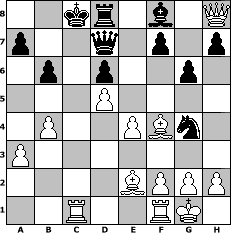 game notation in PGN-format [Event "BENONI"] [Site "www.myChess.de"] [Date "2005.06.20"] [Round "2"] [White "Basal"] [Black "Gno"] [ECO "A56"] [WhitemyELO "1843"] [BlackmyELO "1141"] [Result "1-0"] [TimeControl "10/864000"] [WhiteDays "10"] [BlackDays "10"] [MyChessNo "14217"] 1. d4 Nf6 2. c4 c5 3. dxc5 Qa5+ 4. Nc3 Qxc5 5. Nf3 e5 6. e4 Ng4 7. Qd2 Nc6 8. a3 Nd4 9. Nxd4 exd4 10. Nd5 d6 11. b4 Qc6 12. Qxd4 b6 13. Be2 Qd7 14. Bf4 Bb7 15. O-O Bxd5 16. cxd5 g6 17. Qxh8 O-O-O 18. Rac1+ 1-0 position notation in FEN-format 2kr1b1Q/p2q1p1p/1p1p2p1/3P4/1P2PBn1/P7/4BPPP/2R2RK1 - - - 2 18 Captured white pieces: ![]() ![]() ![]() ![]() ![]() ![]() ![]() ![]() ![]() ![]() ![]() ![]() ![]() ![]() ![]() Captured black pieces: ![]() ![]() ![]() ![]() ![]() ![]() ![]() ![]() ![]() ![]() ![]() ![]() ![]() ![]() ![]() Click on a captured piece in order to display the desired move!