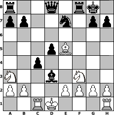 game notation in PGN-format [Event "MySchachOpen"] [Site "www.myChess.de"] [Date "2005.01.22"] [Round "1"] [White "Bernd"] [Black "Fuffy"] [ECO "C22"] [WhitemyELO "1382"] [BlackmyELO "1500"] [Result "0-1"] [TimeControl "10/2592000"] [WhiteDays "00"] [BlackDays "50"] [MyChessNo "9889"] 1. e4 e5 2. d4 exd4 3. Qxd4 Nc6 4. Qc3 Bb4 5. Qxb4 Nxb4 6. Na3 d5 7. e5 Bf5 8. Kd1 Ne7 9. Bg5 O-O 10. Bd3 Nxd3 11. cxd3 Bxd3 12. Nf3 f6 13. Bf4 fxe5 14. Bxe5 c5 15. Rc1 c4 0-1 position notation in FEN-format r2q1rk1/pp2n1pp/8/3pB3/2p5/N2b1N2/PP2PPPP/2RK3R - - - 0 16 Captured white pieces: Captured black pieces: Click on a captured piece in order to display the desired move!