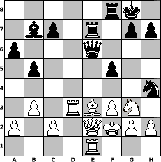 game notation in PGN-format [Event "Quicky-Blitz die Dritte"] [Site "www.myChess.de"] [Date "2009.08.02"] [Round "1"] [White "Schmalte"] [Black "Gauss1233"] [ECO "B01"] [WhitemyELO "1477"] [BlackmyELO "1369"] [Result "0-1"] [TimeControl "10/86400"] [WhiteDays "00"] [BlackDays "01"] [MyChessNo "58017"] 1. e4 d5 2. exd5 Qxd5 3. Nc3 Qd8 4. b3 Nc6 5. Nf3 e5 6. Bb5 Bd7 7. Bxc6 Bxc6 8. O-O Bd6 9. d4 exd4 10. Nxd4 Ne7 11. Qe2 O-O 12. Ndb5 a6 13. Nxd6 Qxd6 14. Rd1 Qg6 15. f3 Nf5 16. Be3 Nh4 17. Ne4 Rfe8 18. Ng3 Qe6 19. Rd3 b5 20. Rad1 Re7 21. Re1 Bb7 22. Kf2 Rae8 23. Nf1 f5 24. Ng3 Rf8 0-1 position notation in FEN-format 5rk1/1bp1r1pp/p3q3/1p3p2/7n/1P1RBPN1/P1P1QKPP/4R3 - - - 2 25 Captured white pieces: Captured black pieces: Click on a captured piece in order to display the desired move!