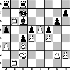 game notation in PGN-format [Event "Neujahr 2015"] [Site "www.myChess.de"] [Date "2014.12.30"] [Round "1"] [White "jeremyt"] [Black "Cuibono"] [ECO "C43"] [WhitemyELO "2073"] [BlackmyELO "2024"] [Result "1/2-1/2"] [TimeControl "10/2592000"] [WhiteDays "82"] [BlackDays "30"] [MyChessNo "97323"] 1. e4 e5 2. Nf3 Nf6 3. d4 Nxe4 4. Bd3 d5 5. Nxe5 Nd7 6. O-O Nxe5 7. dxe5 Nc5 8. Nc3 c6 9. Ne2 Be7 10. f4 f6 11. Be3 O-O 12. Qd2 Nxd3 13. cxd3 c5 14. d4 c4 15. Qc2 g6 16. Ng3 f5 17. Ne2 b5 18. Nc3 Qd7 19. b3 Qc6 20. bxc4 bxc4 21. Rab1 Be6 22. Qb2 a5 23. Qb5 Rfc8 24. Qxc6 Rxc6 25. Rb7 Bb4 26. Bd2 Bc8 27. Rb5 Be6 28. Ra1 Rcc8 29. Rb6 Bd7 30. a3 Bxc3 31. Bxc3 Bc6 32. Rab1 Kf7 33. Kf2 Ke8 34. Ke3 Kd7 35. Kd2 Kc7 36. Kc2 1/2-1/2 position notation in FEN-format r1r5/2k4p/1Rb3p1/p2pPp2/2pP1P2/P1B5/2K3PP/1R6 - - - 10 36 Captured white pieces: Captured black pieces: Click on a captured piece in order to display the desired move!