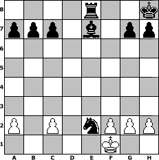 game notation in PGN-format [Event "1. Weltmeisterschaft @ myschach.de"] [Site "www.myChess.de"] [Date "2006.09.15"] [Round "2"] [White "Master1"] [Black "bane"] [ECO "B01"] [WhitemyELO "2017"] [BlackmyELO "1933"] [Result "0-1"] [TimeControl "10/2592000"] [WhiteDays "81"] [BlackDays "87"] [MyChessNo "28517"] 1. e4 d5 2. exd5 Qxd5 3. Nc3 Qd8 4. Nf3 Nf6 5. Bc4 e6 6. O-O Bc5 7. d4 Bd6 8. d5 O-O 9. dxe6 Bxe6 10. Bxe6 fxe6 11. Ng5 Re8 12. Re1 Nc6 13. Nxe6 Qc8 14. Nd5 Rxe6 15. Rxe6 Qxe6 16. Nxf6+ Qxf6 17. Qd5+ Kh8 18. Bg5 Qxb2 19. Re1 Qd4 20. Qxd4 Nxd4 21. Be7 Re8 22. Kf1 Bxe7 23. Re2 Nxe2 0-1 position notation in FEN-format 4r2k/ppp1b1pp/8/8/8/8/P1P1nPPP/5K2 - - - 0 24 Captured white pieces: Captured black pieces: Click on a captured piece in order to display the desired move!