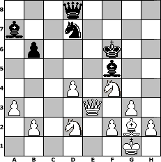 game notation in PGN-format [Event "3. Norderstedter DENK MAL Open 2012"] [Site "www.myChess.de"] [Date "2012.02.08"] [Round "1"] [White "UPS"] [Black "BobbyF4"] [ECO "C40"] [WhitemyELO "1625"] [BlackmyELO "1531"] [Result "1-0"] [TimeControl "10/2592000"] [WhiteDays "28"] [BlackDays "01"] [MyChessNo "79798"] 1. e4 e5 2. Nf3 f5 3. exf5 e4 4. Nd4 Nf6 5. Be2 Bc5 6. Nb3 Bb6 7. Bh5+ Kf8 8. d3 exd3 9. cxd3 Qe7+ 10. Be2 d5 11. O-O Bxf5 12. Nc3 c5 13. Re1 Qd6 14. g3 a6 15. Bf4 Qd7 16. Rc1 Nc6 17. Na4 Ba7 18. Naxc5 Qc8 19. a3 b6 20. Nxa6 Qd7 21. Bf3 Rc8 22. Rc2 Kf7 23. Qd2 h5 24. Rec1 g5 25. Bxg5 Ne5 26. Bg2 Rxc2 27. Rxc2 Rc8 28. Rxc8 Qxc8 29. Bxf6 Kxf6 30. Nb4 Kg6 31. Nxd5 Qd8 32. Nf4+ Kf6 33. Nxh5+ Kg6 34. Nf4+ Kg7 35. d4 Nd7 36. Qe3 Kf6 37. Nd2 1-0 position notation in FEN-format 3q4/b2n4/1p3k2/5b2/3P1N2/P3Q1P1/1P1N1PBP/6K1 - - - 4 37 Captured white pieces: ![]() ![]() ![]() ![]() ![]() ![]() ![]() ![]() ![]() ![]() ![]() ![]() ![]() ![]() ![]() Captured black pieces: ![]() ![]() ![]() ![]() ![]() ![]() ![]() ![]() ![]() ![]() ![]() ![]() ![]() ![]() ![]() Click on a captured piece in order to display the desired move!