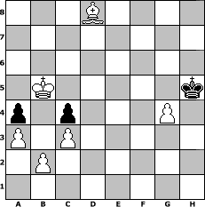 game notation in PGN-format [Event "Anderssen-Club-Meisterschaft"] [Site "www.myChess.de"] [Date "2006.04.11"] [Round "1"] [White "Rickado"] [Black "Matthias"] [ECO "D01"] [WhitemyELO "1528"] [BlackmyELO "1267"] [Result "1-0"] [TimeControl "10/864000"] [WhiteDays "09"] [BlackDays "10"] [MyChessNo "24430"] 1. d4 d5 2. Nc3 h6 3. Nf3 Nf6 4. e3 Bf5 5. Bd3 e6 6. O-O Bxd3 7. Qxd3 Nc6 8. a3 Bd6 9. h3 Nh5 10. Nb5 a6 11. Nxd6+ Qxd6 12. Bd2 O-O-O 13. c3 e5 14. dxe5 Nxe5 15. Nxe5 Qxe5 16. f4 Qf6 17. Kh2 c5 18. g4 c4 19. Qe2 Nxf4 20. Rxf4 Qe5 21. Kg2 g5 22. Rxf7 Rdf8 23. Rxf8+ Rxf8 24. Rf1 Qe4+ 25. Kg1 Rxf1+ 26. Qxf1 Qc2 27. Qc1 Qe4 28. Qe1 b5 29. Bc1 Qf3 30. Qf1 Qxf1+ 31. Kxf1 Kc7 32. Ke2 Kb6 33. Kf3 Kc5 34. e4 a5 35. Be3+ Kd6 36. exd5 Kxd5 37. Bb6 a4 38. Bd8 Ke6 39. Ke4 Kf7 40. Kd5 Kg6 41. Kc5 h5 42. gxh5+ Kxh5 43. Kxb5 g4 44. hxg4+ 1-0 position notation in FEN-format 3B4/8/8/1K5k/p1p3P1/P1P5/1P6/8 - - - 0 44 Captured white pieces: ![]() ![]() ![]() ![]() ![]() ![]() ![]() ![]() ![]() ![]() ![]() ![]() ![]() ![]() ![]() Captured black pieces: ![]() ![]() ![]() ![]() ![]() ![]() ![]() ![]() ![]() ![]() ![]() ![]() ![]() ![]() ![]() Click on a captured piece in order to display the desired move!