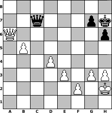 game notation in PGN-format [Event "Trauerspiel :-)"] [Site "www.myChess.de"] [Date "2008.09.20"] [Round "1"] [White "Seneca"] [Black "Master1"] [ECO "A35"] [WhitemyELO "1474"] [BlackmyELO "1262"] [Result "1-0"] [TimeControl "10/864000"] [WhiteDays "06"] [BlackDays "10"] [MyChessNo "48137"] 1. c4 c5 2. Nc3 Nc6 3. Nf3 Nf6 4. e3 d6 5. a3 Bg4 6. Be2 Bxf3 7. Bxf3 e6 8. O-O Be7 9. b3 O-O 10. Bb2 Rc8 11. d3 a6 12. Ne4 Nxe4 13. Bxe4 d5 14. cxd5 exd5 15. Bf3 b5 16. Rc1 Na7 17. Qc2 a5 18. Qd2 h6 19. d4 c4 20. bxc4 b4 21. Bxd5 bxa3 22. Bc3 Nb5 23. Bxf7+ Rxf7 24. cxb5 Bb4 25. Bxb4 axb4 26. Qxb4 Rxc1 27. Rxc1 Ra7 28. Ra1 Qc8 29. h3 a2 30. Qb3+ Kh8 31. Rxa2 Qc1+ 32. Kh2 Rxa2 33. Qxa2 Qc7+ 34. g3 Kh7 35. Qa6 1-0 position notation in FEN-format 8/2q3pk/Q6p/1P6/3P4/4P1PP/5P1K/8 - - - 2 35 Captured white pieces: Captured black pieces: Click on a captured piece in order to display the desired move!