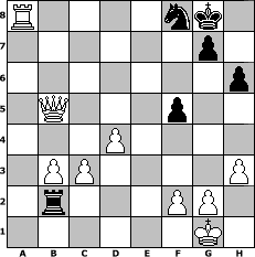 game notation in PGN-format [Event "Aprilturnier"] [Site "www.myChess.de"] [Date "2016.04.22"] [Round "1"] [White "Andylein1989"] [Black "hape50"] [ECO "C41"] [WhitemyELO "1570"] [BlackmyELO "1278"] [Result "1-0"] [TimeControl "10/1728000"] [WhiteDays "49"] [BlackDays "74"] [MyChessNo "103353"] 1. e4 e5 2. Nf3 d6 3. Bc4 c6 4. O-O h6 5. c3 Nf6 6. d3 Qc7 7. h3 Be7 8. Nbd2 d5 9. Bb3 O-O 10. Re1 Be6 11. Bc2 Nbd7 12. Nf1 Nh7 13. Ng3 b5 14. Bd2 Ndf6 15. Qc1 dxe4 16. Nxe4 Nxe4 17. Rxe4 f5 18. Rxe5 Qd6 19. Bf4 Qd7 20. d4 Bd6 21. Re1 Rf6 22. Rxe6 Qxe6 23. Bb3 Qxb3 24. axb3 Bxf4 25. Qxf4 a5 26. Ne5 Ra7 27. Nxc6 Rxc6 28. Qb8+ Nf8 29. Qxa7 Re6 30. Qxa5 Re2 31. Qxb5 Rxb2 32. Ra8 1-0 position notation in FEN-format R4nk1/6p1/7p/1Q3p2/3P4/1PP4P/1r3PP1/6K1 - - - 1 32 Captured white pieces: Captured black pieces: Click on a captured piece in order to display the desired move!