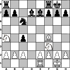 game notation in PGN-format [Event "Aljechin zum z\'Nacht...."] [Site "www.myChess.de"] [Date "2006.09.09"] [Round "2"] [White "reisinger"] [Black "wasserandy"] [ECO "B02"] [WhitemyELO "1631"] [BlackmyELO "1860"] [Result "0-1"] [TimeControl "10/864000"] [WhiteDays "09"] [BlackDays "04"] [MyChessNo "28304"] 1. e4 Nf6 2. e5 Nd5 3. Bc4 Nb6 4. Bb3 c5 5. d3 Nc6 6. Nf3 d5 7. exd6 exd6 8. O-O Be7 9. Re1 O-O 10. Nc3 d5 11. Bf4 c4 12. dxc4 dxc4 13. Ba4 Nxa4 14. Nxa4 Qxd1 15. Raxd1 Bg4 16. Rd7 Bxd7 0-1 position notation in FEN-format r4rk1/pp1bbppp/2n5/8/N1p2B2/5N2/PPP1PPPP/4R1K1 - - - 0 17 Captured white pieces: ![]() ![]() ![]() ![]() ![]() ![]() ![]() ![]() ![]() ![]() ![]() ![]() ![]() ![]() ![]() Captured black pieces: ![]() ![]() ![]() ![]() ![]() ![]() ![]() ![]() ![]() ![]() ![]() ![]() ![]() ![]() ![]() Click on a captured piece in order to display the desired move!