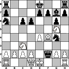 game notation in PGN-format [Event "Gary COME BACK Turnier"] [Site "www.myChess.de"] [Date "2005.03.18"] [Round "1"] [White "Hobbykegler"] [Black "Chaos"] [ECO "A45"] [WhitemyELO "1114"] [BlackmyELO "1730"] [Result "0-1"] [TimeControl "10/1728000"] [WhiteDays "19"] [BlackDays "20"] [MyChessNo "11267"] 1. d4 Nf6 2. e3 g6 3. Nc3 Bg7 4. e4 d6 5. d5 c6 6. dxc6 bxc6 7. Be3 Ba6 8. Bxa6 Nxa6 9. Nf3 Ng4 10. Bf4 Qb6 11. Ng5 Qxf2# 0-1 position notation in FEN-format r3k2r/p3ppbp/n1pp2p1/6N1/4PBn1/2N5/PPPP1qPP/R2QK2R - KQkq - 0 12 Captured white pieces: Captured black pieces: Click on a captured piece in order to display the desired move!