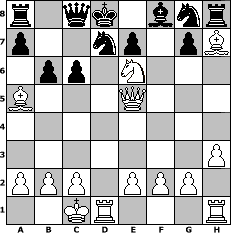 game notation in PGN-format [Event "Mal was anderes"] [Site "www.myChess.de"] [Date "2004.05.23"] [Round "2"] [White "TAR"] [Black "Juri"] [ECO "B07"] [WhitemyELO "1542"] [BlackmyELO "1511"] [Result "1-0"] [TimeControl "10/864000"] [WhiteDays "12"] [BlackDays "18"] [MyChessNo "4796"] 1. e4 d6 2. d4 Nf6 3. Nc3 c6 4. Nf3 Bg4 5. h3 Bh5 6. Bd3 Qa5 7. Bd2 Qb6 8. e5 Bxf3 9. Qxf3 dxe5 10. dxe5 Ng8 11. e6 fxe6 12. Qh5+ Kd8 13. Na4 Qc7 14. Nc5 Qc8 15. Ba5+ b6 16. O-O-O Kc7 17. Qe5+ Kd8 18. Bxh7+ Nd7 19. Nxe6+ 1-0 position notation in FEN-format r1qk1bnr/p2np1pB/1pp1N3/B3Q3/8/7P/PPP1PPP1/2KR3R - - - 0 19 Captured white pieces: ![]() ![]() ![]() ![]() ![]() ![]() ![]() ![]() ![]() ![]() ![]() ![]() ![]() ![]() ![]() Captured black pieces: ![]() ![]() ![]() ![]() ![]() ![]() ![]() ![]() ![]() ![]() ![]() ![]() ![]() ![]() ![]() Click on a captured piece in order to display the desired move!