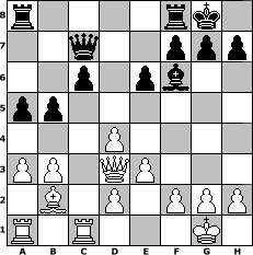 game notation in PGN-format [Event "Für die kalten Tage..."] [Site "www.myChess.de"] [Date "2018.02.09"] [Round "2"] [White "FrankB"] [Black "Rotstift10"] [ECO "D02"] [WhitemyELO "1706"] [BlackmyELO "1579"] [Result "0-1"] [TimeControl "10/1728000"] [WhiteDays "00"] [BlackDays "18"] [MyChessNo "111361"] 1. d4 d5 2. Nf3 c6 3. e3 Bf5 4. c4 dxc4 5. Bxc4 e6 6. a3 Nf6 7. Nc3 a5 8. O-O b5 9. Bd3 Bxd3 10. Qxd3 Be7 11. b3 O-O 12. Bb2 Nbd7 13. Rfd1 Nb6 14. Ne5 Qc7 15. Ne4 Nbd7 16. Nxd7 Nxd7 17. Rdc1 Nf6 18. Nxf6+ Bxf6 0-1 position notation in FEN-format r4rk1/2q2ppp/2p1pb2/pp6/3P4/PP1QP3/1B1P1PPP/R1R3K1 - - - 0 19 Captured white pieces: Captured black pieces: Click on a captured piece in order to display the desired move!