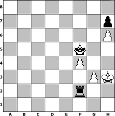 game notation in PGN-format [Event "Ein Turnier, ein Turnier! Oma wir danken dir!"] [Site "www.myChess.de"] [Date "2010.08.04"] [Round "1"] [White "Gauss1233"] [Black "sprinterde"] [ECO "A40"] [WhitemyELO "1519"] [BlackmyELO "1584"] [Result "0-1"] [TimeControl "10/864000"] [WhiteDays "26"] [BlackDays "41"] [MyChessNo "67458"] 1. d4 e6 2. c4 c6 3. Nc3 Bb4 4. Bd2 Nf6 5. a3 Bxc3 6. Bxc3 d5 7. e3 Ne4 8. cxd5 Qf6 9. Qf3 cxd5 10. Qxf6 gxf6 11. g3 Nd7 12. Bg2 Nxc3 13. bxc3 Nb6 14. Ne2 Bd7 15. O-O Bb5 16. Bf3 Na4 17. Rfc1 Rc8 18. Rab1 Bxe2 19. Bxe2 Nxc3 20. Bb5+ Ke7 21. Kf1 Nxb1 22. Rxb1 a6 23. Bd3 b5 24. a4 Rb8 25. axb5 axb5 26. Rxb5 Rxb5 27. Bxb5 Rb8 28. Be2 e5 29. dxe5 fxe5 30. Kg2 f5 31. h3 d4 32. exd4 exd4 33. Kf3 Rb3+ 34. Kf4 d3 35. Bd1 Rb1 36. Bf3 d2 37. Kxf5 d1=Q 38. Bxd1 Rxd1 39. f4 Rd5+ 40. Kg4 Kf6 41. h4 Kg6 42. Kh3 Kf5 43. h5 Rd2 44. h6 Rf2 0-1 position notation in FEN-format 8/7p/7P/5k2/5P2/6PK/5r2/8 - - - 1 45 Captured white pieces: ![]() ![]() ![]() ![]() ![]() ![]() ![]() ![]() ![]() ![]() ![]() ![]() ![]() ![]() ![]() Captured black pieces: ![]() ![]() ![]() ![]() ![]() ![]() ![]() ![]() ![]() ![]() ![]() ![]() ![]() ![]() ![]() Click on a captured piece in order to display the desired move!