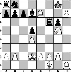 game notation in PGN-format [Event "Schach dem Nikolaus VII"] [Site "www.myChess.de"] [Date "2020.11.23"] [Round "1"] [White "Lohl"] [Black "sprinterde"] [ECO "C01"] [WhitemyELO "1789"] [BlackmyELO "1721"] [Result "1-0"] [TimeControl "10/2592000"] [WhiteDays "29"] [BlackDays "30"] [MyChessNo "119944"] 1. e4 e6 2. d4 Nf6 3. e5 Nd5 4. c4 Ne7 5. Nc3 Ng6 6. Nf3 Bb4 7. Bg5 Be7 8. Bxe7 Qxe7 9. h4 O-O 10. h5 Nh8 11. h6 g6 12. Ne4 f5 13. exf6 Qb4+ 14. Qd2 Qxd2+ 15. Kxd2 d5 16. cxd5 exd5 17. Neg5 Rxf6 18. Re1 Bd7 19. Re7 Nf7 20. Nxh7 Rb6 21. Nhg5 Nxg5 22. Nxg5 Rf6 23. h7+ 1-0 position notation in FEN-format rn4k1/pppbR2P/5rp1/3p2N1/3P4/8/PP1KPPP1/5B1R - - - 0 23 Captured white pieces: ![]() ![]() ![]() ![]() ![]() ![]() ![]() ![]() ![]() ![]() ![]() ![]() ![]() ![]() ![]() Captured black pieces: ![]() ![]() ![]() ![]() ![]() ![]() ![]() ![]() ![]() ![]() ![]() ![]() ![]() ![]() ![]() Click on a captured piece in order to display the desired move!