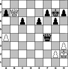 game notation in PGN-format [Event "Sommer-ade,scheiden tut weh."] [Site "www.myChess.de"] [Date "2013.09.18"] [Round "1"] [White "Knight"] [Black "Joschi"] [ECO "B17"] [WhitemyELO "1290"] [BlackmyELO "1598"] [Result "0-1"] [TimeControl "10/1728000"] [WhiteDays "20"] [BlackDays "20"] [MyChessNo "90293"] 1. e4 c6 2. d4 d5 3. Nc3 dxe4 4. Nxe4 Nd7 5. Nf3 Ngf6 6. Nxf6+ Nxf6 7. Bg5 Bg4 8. Be2 e6 9. O-O Be7 10. Ne5 Bxe2 11. Qxe2 Qxd4 12. c3 Qb6 13. Rfd1 Rd8 14. Rxd8+ Bxd8 15. b3 Be7 16. Rd1 Nd5 17. Bd2 Qc7 18. c4 Nf6 19. Bc3 O-O 20. h3 Rd8 21. Rxd8+ Qxd8 22. f4 Qb6+ 23. Kh1 Bb4 24. Bxb4 Qxb4 25. Qd3 Qb6 26. a4 g6 27. Nd7 Nxd7 28. Qxd7 Qxb3 29. c5 Qb4 30. Qc8+ Kg7 31. Qc7 Qxc5 32. Qxb7 Qc1+ 33. Kh2 Qxf4+ 0-1 position notation in FEN-format 8/pQ3pkp/2p1p1p1/8/P4q2/7P/6PK/8 - - - 0 34 Captured white pieces: Captured black pieces: Click on a captured piece in order to display the desired move!