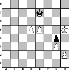 game notation in PGN-format [Event "around 1510"] [Site "www.myChess.de"] [Date "2005.03.07"] [Round "1"] [White "Festungsschach"] [Black "Caligula"] [ECO "B12"] [WhitemyELO "1579"] [BlackmyELO "1383"] [Result "1-0"] [TimeControl "10/864000"] [WhiteDays "10"] [BlackDays "10"] [MyChessNo "10942"] 1. e4 c6 2. d4 d5 3. e5 e6 4. Nf3 g6 5. Bd3 Ne7 6. Bg5 Nd7 7. b4 b5 8. Qd2 h6 9. Bh4 g5 10. Bg3 a5 11. c3 Bg7 12. O-O f6 13. exf6 Bxf6 14. Bd6 axb4 15. Bxb4 Ng8 16. Re1 Ne7 17. Rxe6 Kf8 18. Bxe7+ Bxe7 19. Ne5 Nxe5 20. Rxe5 Bd6 21. Re2 Qf6 22. Qe3 Bf5 23. Bxf5 Qxf5 24. Qe6 Qxe6 25. Rxe6 Re8 26. Rxe8+ Kxe8 27. a4 bxa4 28. Rxa4 Kd7 29. Ra7+ Bc7 30. Nd2 Re8 31. g3 Kd6 32. Nf3 Re7 33. Ne5 Bd8 34. Rxe7 Kxe7 35. Nxc6+ Kd7 36. Ne5+ Ke6 37. Kg2 Bc7 38. f4 Bxe5 39. fxe5 Kf5 40. Kf3 g4+ 41. Ke3 h5 42. Kd3 Ke6 43. c4 dxc4+ 44. Kxc4 Kd7 45. Kd5 Ke7 46. Ke4 Ke6 47. d5+ Ke7 48. Kf5 Kd7 49. Kg5 Ke7 50. Kxh5 1-0 position notation in FEN-format 8/4k3/8/3PP2K/6p1/6P1/7P/8 - - - 0 50 Captured white pieces: Captured black pieces: Click on a captured piece in order to display the desired move!
