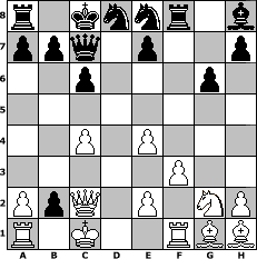 game notation in PGN-format [Event "3. Chess960/1"] [Site "www.myChess.de"] [Date "2009.04.06"] [Round "1"] [White "miluetz"] [Black "guneu2002@"] [Variant "Fischerrandom"] [SetUp "1"] [FEN "rqknnrbb/pppppppp/8/8/8/8/PPPPPPPP/RQKNNRBB w KQkq - 0 1"] [WhitemyELO "1502"] [BlackmyELO "1500"] [Result "0-1"] [TimeControl "10/3456000"] [WhiteDays "65"] [BlackDays "87"] [MyChessNo "54659"] 1. e4 g6 2. g3 f5 3. d3 f4 4. f3 c6 5. gxf4 Qxf4+ 6. Ne3 d5 7. c3 d4 8. N1g2 Qc7 9. Nc4 dxc3 10. Qc2 Bxc4 11. dxc4 cxb2+ 0-1 position notation in FEN-format r1knnr1b/ppq1p2p/2p3p1/8/2P1P3/5P2/PpQ1P1NP/R1K2RBB - KQkq - 0 12 Captured white pieces: Captured black pieces: Click on a captured piece in order to display the desired move!