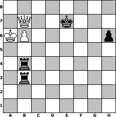 game notation in PGN-format [Event "Winter 2011/12"] [Site "www.myChess.de"] [Date "2011.12.22"] [Round "1"] [White "Lemmi11"] [Black "HPB2005"] [ECO "A00"] [WhitemyELO "1813"] [BlackmyELO "1936"] [Result "1/2-1/2"] [TimeControl "10/2592000"] [WhiteDays "381"] [BlackDays "287"] [MyChessNo "78342"] 1. Nc3 c5 2. e4 d6 3. Bb5+ Bd7 4. Bxd7+ Qxd7 5. Nf3 Nc6 6. d4 cxd4 7. Nxd4 g6 8. Be3 Bg7 9. O-O Rb8 10. f3 Nf6 11. Qe2 O-O 12. Rad1 a6 13. a3 Qc7 14. f4 Rfe8 15. Qf3 e5 16. Nde2 exf4 17. Nxf4 Ne5 18. Qe2 b5 19. Bd4 Rbc8 20. Kh1 Qd7 21. b3 Qc6 22. Rfe1 Kh8 23. Qe3 Neg4 24. Qg3 a5 25. Nfd5 Ne5 26. Re2 Kg8 27. Kg1 Nxd5 28. Nxd5 Qa6 29. Rf2 a4 30. b4 Re6 31. Rdf1 Qc6 32. c3 Rf8 33. Qh3 Qc4 34. Qh4 Ree8 35. Rd1 Re6 36. Qg5 Rfe8 37. Rdf1 Rf8 38. h3 Ree8 39. Kh1 Rb8 40. h4 Rbe8 41. h5 h6 42. Qf4 g5 43. Qf5 Re6 44. Kg1 Qc8 45. Rd1 Bh8 46. Qh3 Qd7 47. Rdf1 Bg7 48. Rb1 Rb8 49. Bxe5 Bxe5 50. Qd3 Qc6 51. Rbf1 Rf8 52. g3 Bh8 53. Kg2 Bg7 54. Rf5 Be5 55. Qf3 Qd7 56. Rc1 Bg7 57. Qd3 Qc6 58. c4 Rc8 59. Qf3 Rf8 60. Rf1 g4 61. Qf4 Qxc4 62. Rxf7 Qe2+ 63. Rf2 Qxf2+ 64. Qxf2 Rxf7 65. Qc2 Re8 66. Ne3 Rf3 67. Nf5 Be5 68. Qe2 Rf8 69. Qxb5 Rxa3 70. Qd5+ Kh7 71. Qe6 Bf6 72. Nxd6 Rd3 73. Nf7 Rd2+ 74. Kf1 Kg7 75. Ke1 Rh2 76. e5 Rxf7 77. exf6+ Rxf6 78. Qxg4+ Kf8 79. Qc8+ Kg7 80. Qd7+ Kf8 81. Qxa4 Rxh5 82. Qa8+ Kf7 83. Qb7+ Ke6 84. b5 Kd6 85. Qb6+ Ke7 86. Qc7+ Ke8 87. Qb7 Re6+ 88. Kd2 Rh2+ 89. Kc3 Rh5 90. Kc4 Rh2 91. Qc8+ Ke7 92. Qc7+ Kf8 93. Qd8+ Kf7 94. Qd7+ Re7 95. Qd5+ Kg7 96. b6 Rc2+ 97. Kb3 Rc1 98. Qd4+ Kh7 99. Ka4 Rce1 100. Qd3+ Kh8 101. Ka5 R1e5+ 102. Ka6 R5e6 103. Qc2 Kg7 104. Qc8 Rg6 105. Ka5 Re5+ 106. Ka4 Rxg3 107. Qd7+ Kf6 108. Qd6+ Kf5 109. Qf8+ Ke6 110. Qb4 Rg1 111. Qc3 Rg4+ 112. Ka3 Reg5 113. Qc6+ Ke7 114. Kb3 Rg3+ 115. Kc4 R5g4+ 116. Kb5 Rb3+ 117. Ka6 Rgb4 118. Qc5+ Ke6 119. Qc8+ Ke7 120. Qc7+ Ke6 121. Qc6+ Ke7 122. Qb7+ 1/2-1/2 position notation in FEN-format 8/1Q2k3/KP5p/8/1r6/1r6/8/8 - - - 31 122 Captured white pieces: Captured black pieces: Click on a captured piece in order to display the desired move!