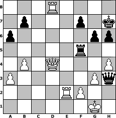 game notation in PGN-format [Event "Es wird bald Sommer"] [Site "www.myChess.de"] [Date "2015.05.12"] [Round "1"] [White "Joschi"] [Black "muellerh"] [ECO "B32"] [WhitemyELO "1574"] [BlackmyELO "1522"] [Result "1-0"] [TimeControl "10/2592000"] [WhiteDays "30"] [BlackDays "20"] [MyChessNo "99216"] 1. e4 c5 2. Nf3 Nc6 3. d4 cxd4 4. Nxd4 e5 5. Nb5 Nf6 6. Bg5 Qa5+ 7. N1c3 Be7 8. Bxf6 Bxf6 9. Nd6+ Kf8 10. Bb5 a6 11. Bxc6 dxc6 12. Nxc8 Rxc8 13. O-O g6 14. Qd6+ Kg7 15. Qd3 Rhd8 16. Qe3 h6 17. Rfd1 Rd4 18. a3 Rcd8 19. g3 Bg5 20. Qf3 R8d6 21. h4 Bd2 22. Ne2 Rf6 23. Qb3 Rxe4 24. Qd3 Rd4 25. Nxd4 exd4 26. Rxd2 c5 27. c3 Qb6 28. cxd4 Rd6 29. Rad1 cxd4 30. Qc4 Qa5 31. Rxd4 Rc6 32. Qd3 Rf6 33. b4 Qb6 34. Rd2 Qe6 35. Re2 Qh3 36. Rd6 Rf5 37. Qd4+ Kh7 38. Rd8 1-0 position notation in FEN-format 3R4/1p3p1k/p5pp/5r2/1P1Q3P/P5Pq/4RP2/6K1 - - - 10 38 Captured white pieces: Captured black pieces: Click on a captured piece in order to display the desired move!