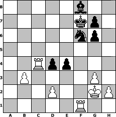 game notation in PGN-format [Event "Love, Peace and Harmony 1"] [Site "www.myChess.de"] [Date "2010.05.08"] [Round "1"] [White "Zoidberg"] [Black "espero"] [ECO "A45"] [WhitemyELO "1831"] [BlackmyELO "1669"] [Result "1-0"] [TimeControl "10/864000"] [WhiteDays "32"] [BlackDays "33"] [MyChessNo "65426"] 1. d4 Nf6 2. f3 c5 3. d5 e5 4. e4 d6 5. c4 Be7 6. Nc3 O-O 7. Bd3 Ne8 8. Nge2 f5 9. exf5 Bxf5 10. O-O Nd7 11. Ne4 Bxe4 12. Bxe4 Nef6 13. Bc2 a6 14. Nc3 Qe8 15. Be3 Rb8 16. Qd3 Rf7 17. Rae1 Nf8 18. Re2 b5 19. b3 Nh5 20. g3 Qd7 21. Kg2 Ng6 22. cxb5 axb5 23. a4 bxa4 24. Nxa4 Rb4 25. Nb2 Rd4 26. Qc3 Rxd5 27. Qc4 Rd4 28. Bxd4 cxd4 29. Bxg6 hxg6 30. Rc2 d5 31. Qc8+ Bf8 32. Qxd7 Rxd7 33. Rc8 Nf6 34. Nd3 e4 35. fxe4 dxe4 36. Ne5 Rf7 37. Nxf7 Kxf7 38. Rc4 1-0 position notation in FEN-format 5b2/5kp1/5np1/8/2Rpp3/1P4P1/3P2KP/5R2 - - - 1 38 Captured white pieces: Captured black pieces: Click on a captured piece in order to display the desired move!