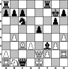 game notation in PGN-format [Event "4.Clubmeisterschaft Aljechins Enkel 2010"] [Site "www.myChess.de"] [Date "2010.12.07"] [Round "1"] [White "Schefsche"] [Black "Helmut48"] [ECO "B01"] [WhitemyELO "1393"] [BlackmyELO "1854"] [Result "0-1"] [TimeControl "10/3456000"] [WhiteDays "82"] [BlackDays "78"] [MyChessNo "70440"] 1. e4 d5 2. e5 d4 3. Bc4 Nc6 4. Qh5 Nh6 5. e6 g6 6. exf7+ Nxf7 7. Bxf7+ Kxf7 8. Qf3+ Kg7 9. d3 e5 10. h4 Bb4+ 11. Bd2 Rf8 12. Qe2 Qd5 13. Rh2 Qc5 14. c3 dxc3 15. bxc3 Bg4 16. cxb4 Qd4 17. Bc3 Qf4 18. Nf3 Bxf3 19. g3 Qc1+ 0-1 position notation in FEN-format r4r2/ppp3kp/2n3p1/4p3/1P5P/2BP1bP1/P3QP1R/RNq1K3 - Q - 1 20 Captured white pieces: ![]() ![]() ![]() ![]() ![]() ![]() ![]() ![]() ![]() ![]() ![]() ![]() ![]() ![]() ![]() Captured black pieces: ![]() ![]() ![]() ![]() ![]() ![]() ![]() ![]() ![]() ![]() ![]() ![]() ![]() ![]() ![]() Click on a captured piece in order to display the desired move!