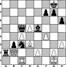 game notation in PGN-format [Event "Die letzten Sommertage!!!"] [Site "www.myChess.de"] [Date "2009.09.12"] [Round "1"] [White "Joschi"] [Black "Zargoz"] [ECO "C41"] [WhitemyELO "1573"] [BlackmyELO "1415"] [Result "0-1"] [TimeControl "10/864000"] [WhiteDays "33"] [BlackDays "35"] [MyChessNo "58922"] 1. e4 e5 2. Nf3 d6 3. Bc4 h6 4. c3 a6 5. h3 b5 6. Bb3 Bb7 7. Bc2 Nf6 8. d3 c5 9. Be3 Be7 10. Nbd2 Nbd7 11. O-O O-O 12. a4 Bc6 13. axb5 axb5 14. d4 exd4 15. cxd4 b4 16. b3 Qb6 17. Nc4 Qb7 18. d5 Bb5 19. Re1 Bxc4 20. bxc4 Rxa1 21. Qxa1 Ra8 22. Qb2 Qa6 23. Bd3 Nb6 24. Rc1 Na4 25. Qb3 Nc3 26. e5 Nfe4 27. exd6 Bxd6 28. Nd2 Nxd2 29. Bxd2 Be5 30. Be3 Qb6 31. f4 Ra3 32. Qc2 b3 33. Qb2 Ra2 34. Bxc5 Qxc5+ 0-1 position notation in FEN-format 6k1/5pp1/7p/2qPb3/2P2P2/1pnB3P/rQ2P1P1/2R3K1 - - - 0 35 Captured white pieces: Captured black pieces: Click on a captured piece in order to display the desired move!