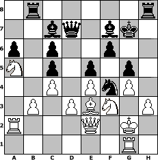 game notation in PGN-format [Event "MLN OPEN 01"] [Site "www.myChess.de"] [Date "2013.11.25"] [Round "1"] [White "mattse"] [Black "Erich"] [ECO "C68"] [WhitemyELO "1783"] [BlackmyELO "2041"] [Result "0-1"] [TimeControl "10/2592000"] [WhiteDays "30"] [BlackDays "30"] [MyChessNo "91342"] 1. e4 e5 2. Nf3 Nc6 3. Bb5 a6 4. Bxc6 dxc6 5. O-O Bg4 6. h3 Bh5 7. d3 Bd6 8. Be3 Nf6 9. Nbd2 O-O 10. Nc4 Qe7 11. a3 b5 12. Na5 c5 13. Rc1 Nd7 14. c4 f6 15. g4 Bf7 16. Nh4 g6 17. Qd2 Rfc8 18. Nc6 Qe8 19. Na5 c6 20. Rc2 Rab8 21. Rfc1 b4 22. axb4 Rxb4 23. Nf3 Nf8 24. b3 Qd7 25. Ne1 Ne6 26. Ra2 Rbb8 27. Rb1 Kg7 28. Bh6+ Kh8 29. Be3 h5 30. f3 hxg4 31. fxg4 Kg7 32. Bh6+ Kh7 33. Be3 Rh8 34. Nf3 Kg7 35. Kg2 g5 36. Rg1 Bc7 37. Qe2 Nf4+ 0-1 position notation in FEN-format 1r5r/2bq1bk1/p1p2p2/N1p1p1p1/2P1PnP1/1P1PBN1P/R3Q1K1/6R1 - - - 4 38 Captured white pieces: Captured black pieces: Click on a captured piece in order to display the desired move!