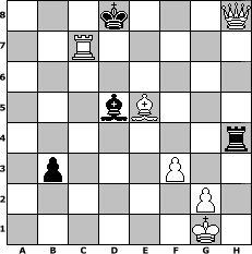 game notation in PGN-format [Event "°°°°``Der sch"] [Site "www.myChess.de"] [Date "2009.05.11"] [Round "1"] [White "ujack1961"] [Black "Papale"] [ECO "C57"] [WhitemyELO "1584"] [BlackmyELO "1763"] [Result "1-0"] [TimeControl "10/864000"] [WhiteDays "58"] [BlackDays "58"] [MyChessNo "55552"] 1. e4 e5 2. Nf3 Nc6 3. Bc4 Nf6 4. Ng5 d5 5. exd5 b5 6. Bxb5 Qxd5 7. Bxc6+ Qxc6 8. O-O Bb7 9. Nf3 Bc5 10. Nc3 O-O-O 11. Qe2 e4 12. Ne5 Qe6 13. Nc4 Rhe8 14. Na4 Bd4 15. c3 Bb6 16. b3 Nd5 17. d4 exd3 18. Qxe6+ Rxe6 19. Bg5 f6 20. Bd2 Ne7 21. Rfe1 Rxe1+ 22. Rxe1 Nf5 23. Naxb6+ axb6 24. f3 Nh4 25. Re7 Nf5 26. Re1 g5 27. Nb2 h5 28. Re6 Rf8 29. Nxd3 Rd8 30. Rxf6 Rxd3 31. Bxg5 Nd6 32. Rh6 Rxc3 33. Rh8+ Kd7 34. Rxh5 Rc2 35. Rh7+ Kc6 36. Bd8 Ne8 37. Re7 Rxa2 38. Rxe8 Kd7 39. Rh8 Rb2 40. Bg5 Rxb3 41. Rh7+ Kc8 42. Bf4 Rc3 43. h4 Bd5 44. h5 Rc4 45. Be5 b5 46. h6 b4 47. Rg7 Rh4 48. Rxc7+ Kd8 49. h7 b3 50. h8=Q+ 1-0 position notation in FEN-format 3k3Q/2R5/8/3bB3/7r/1p3P2/6P1/6K1 - - - 0 50 Captured white pieces: Captured black pieces: Click on a captured piece in order to display the desired move!