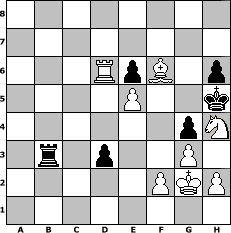 game notation in PGN-format [Event "2018"] [Site "www.myChess.de"] [Date "2018.01.01"] [Round "1"] [White "Master1"] [Black "wolni55"] [ECO "D00"] [WhitemyELO "1282"] [BlackmyELO "1428"] [Result "1-0"] [TimeControl "10/1728000"] [WhiteDays "06"] [BlackDays "10"] [MyChessNo "110876"] 1. d4 d5 2. e3 a6 3. Bd3 e6 4. Nf3 Nf6 5. Nbd2 h6 6. O-O Bd6 7. Re1 O-O 8. e4 Bf4 9. e5 Nfd7 10. g3 Bxd2 11. Bxd2 Nb6 12. b3 Nc6 13. a3 Ne7 14. c3 Bd7 15. c4 Qc8 16. c5 Bb5 17. Bxb5 axb5 18. cxb6 c6 19. Bb4 Re8 20. Bc5 Qd8 21. a4 bxa4 22. Rxa4 Qd7 23. Ra7 Rxa7 24. bxa7 Ra8 25. b4 Nc8 26. Qe2 Nxa7 27. Ra1 b6 28. Bxb6 Qb7 29. Qa6 Qxa6 30. Rxa6 Rb8 31. Bxa7 Rxb4 32. Bc5 Rb3 33. Kg2 Kh7 34. Rxc6 Kg6 35. Nh4+ Kg5 36. Be7+ Kh5 37. Rc7 g5 38. Nf3 Rd3 39. Bf6 g4 40. Nh4 Rxd4 41. Rxf7 Rc4 42. Re7 Rc6 43. Rg7 d4 44. Rd7 Rb6 45. Rg7 d3 46. Rd7 Rb3 47. Rd6 1-0 position notation in FEN-format 8/8/3RpB1p/4P2k/6pN/1r1p2P1/5PKP/8 - - - 3 47 Captured white pieces: Captured black pieces: Click on a captured piece in order to display the desired move!
