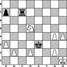 game notation in PGN-format [Event "Herbstturnier"] [Site "www.myChess.de"] [Date "2004.11.18"] [Round "1"] [White "Seneca"] [Black "Hobbykegler"] [ECO "D20"] [WhitemyELO "1619"] [BlackmyELO "1086"] [Result "1-0"] [TimeControl "10/864000"] [WhiteDays "40"] [BlackDays "21"] [MyChessNo "8176"] 1. d4 d5 2. c4 dxc4 3. Nc3 e6 4. e4 Nc6 5. Nf3 Bb4 6. Bxc4 Nge7 7. Bg5 h6 8. Bh4 g5 9. Bg3 f5 10. exf5 Nxf5 11. O-O Nxg3 12. fxg3 O-O 13. Kh1 g4 14. Ng1 Ne7 15. Qxg4+ Kh8 16. Bxe6 Bxe6 17. Qxe6 Nc6 18. Qxh6+ Kg8 19. Rxf8+ Qxf8 20. Qe6+ Qf7 21. Qxf7+ Kxf7 22. Rf1+ Ke6 23. d5+ Kd6 24. dxc6 Kxc6 25. Nge2 Kc5 26. h4 Kc4 27. Rf4+ Kc5 28. a3 Bxc3 29. Nxc3 Rd8 30. g4 b5 31. Rf5+ Kc4 32. Rxb5 Rc8 33. Rb4+ Kd3 34. Rb7 Ke3 35. Rxc7 Rxc7 36. Nd5+ 1-0 position notation in FEN-format 8/p1r5/8/3N4/6PP/P3k3/1P1P2P1/7K - - - 1 36 Captured white pieces: Captured black pieces: Click on a captured piece in order to display the desired move!