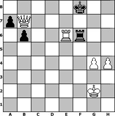game notation in PGN-format [Event "Aljechin Verteidigung"] [Site "www.myChess.de"] [Date "2006.01.30"] [Round "2"] [White "Juliette2103"] [Black "Antaeus"] [ECO "B05"] [WhitemyELO "2078"] [BlackmyELO "1826"] [Result "1-0"] [TimeControl "10/864000"] [WhiteDays "57"] [BlackDays "59"] [MyChessNo "22071"] 1. e4 Nf6 2. e5 Nd5 3. d4 d6 4. Nf3 Bg4 5. Be2 Bxf3 6. Bxf3 c6 7. e6 Qa5+ 8. Bd2 Qb5 9. exf7+ Kxf7 10. Na3 Qxb2 11. Bxd5+ cxd5 12. Qf3+ Ke8 13. Rb1 Qxd4 14. Nb5 Qc4 15. Rb4 Qc5 16. O-O Nd7 17. Nd4 Rc8 18. Qh3 b6 19. Rc1 Nf6 20. Ne6 Qc6 21. Rf4 g6 22. c4 h5 23. Bc3 Bh6 24. Bxf6 Bxf4 25. Nxf4 exf6 26. Qe6+ Kd8 27. Nxd5 Re8 28. Qxf6+ Kd7 29. Rd1 Re2 30. Qf7+ Kd8 31. Qxg6 Qxc4 32. Qxd6+ Ke8 33. Nf4 Re7 34. Qh6 Rc6 35. Qh8+ Kf7 36. Qxh5+ Kg7 37. Qg4+ Kf7 38. Qf5+ Rf6 39. Qh5+ Kg7 40. Qg5+ Kf7 41. Nd5 Rfe6 42. Nxe7 Rxe7 43. h4 Qxa2 44. Rd5 Qb1+ 45. Kh2 Qe4 46. f3 Qe3 47. Qh5+ Kf6 48. Rg5 Qf4+ 49. g3 Qd2+ 50. Kh3 Qd7+ 51. g4 Rf7 52. Qg6+ Ke7 53. Qe4+ Qe6 54. Re5 Rxf3+ 55. Kg2 Rf6 56. Qb7+ Kf8 57. Rxe6 1-0 position notation in FEN-format 5k2/pQ6/1p2Rr2/8/6PP/8/6K1/8 - - - 0 57 Captured white pieces: Captured black pieces: Click on a captured piece in order to display the desired move!