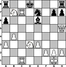 game notation in PGN-format [Event "Herbstturnier"] [Site "www.myChess.de"] [Date "2004.11.18"] [Round "1"] [White "Chelly"] [Black "Goebi"] [ECO "D02"] [WhitemyELO "1613"] [BlackmyELO "1479"] [Result "1-0"] [TimeControl "10/864000"] [WhiteDays "16"] [BlackDays "12"] [MyChessNo "8173"] 1. d4 d5 2. Nf3 Nf6 3. Bf4 Nc6 4. e3 Ne4 5. Nbd2 Nb4 6. a3 Nc6 7. c4 f6 8. cxd5 Qxd5 9. Bc4 Qa5 10. O-O e5 11. b4 Qb6 12. dxe5 fxe5 13. Nxe5 Bd6 14. Nd3 Ne7 15. Nxe4 Ng6 16. Bxd6 cxd6 17. Qh5 Qc6 18. Bb5 Qxb5 19. Nxd6+ Ke7 20. Nxb5 Be6 21. Rac1 a6 22. Rc7+ Ke8 23. Nd6+ Kd8 24. Rfc1 Ne7 25. Nxb7# 1-0 position notation in FEN-format r2k3r/1NR1n1pp/p3b3/7Q/1P6/P2NP3/5PPP/2R3K1 - - - 0 25 Captured white pieces: Captured black pieces: Click on a captured piece in order to display the desired move!