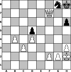 game notation in PGN-format [Event "F"] [Site "www.myChess.de"] [Date "2017.08.16"] [Round "1"] [White "jeremyt"] [Black "Joschi"] [ECO "B13"] [WhitemyELO "2142"] [BlackmyELO "1628"] [Result "1-0"] [TimeControl "10/2592000"] [WhiteDays "095"] [BlackDays "120"] [MyChessNo "109174"] 1. e4 c6 2. d4 d5 3. exd5 cxd5 4. Bd3 Nc6 5. c3 Nf6 6. Bf4 e6 7. Nf3 Bd6 8. Bxd6 Qxd6 9. O-O O-O 10. Re1 a6 11. Nbd2 b5 12. b4 Bb7 13. Nb3 Rad8 14. a4 bxa4 15. Nc5 Qc7 16. Rxa4 Ra8 17. Qe2 Qb6 18. Rea1 Ra7 19. Bxa6 Bxa6 20. Rxa6 Rxa6 21. Rxa6 Qc7 22. Nxe6 fxe6 23. Qxe6+ Kh8 24. Rxc6 Qa7 25. h3 Re8 26. Rc8 Rxc8 27. Qxc8+ Ng8 28. Ne5 h6 29. Kh2 Kh7 30. Qf5+ g6 31. Qxg6+ Kh8 32. Nf7+ Qxf7 33. Qxf7 1-0 position notation in FEN-format 6nk/5Q2/7p/3p4/1P1P4/2P4P/5PPK/8 - - - 0 33 Captured white pieces: Captured black pieces: Click on a captured piece in order to display the desired move!