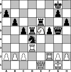 game notation in PGN-format [Event "Ja, is denn heut scho Weihnachten?"] [Site "www.myChess.de"] [Date "2014.12.06"] [Round "1"] [White "freizeitspieler"] [Black "pepo47"] [ECO "A45"] [WhitemyELO "1582"] [BlackmyELO "2083"] [Result "0-1"] [TimeControl "10/2592000"] [WhiteDays "75"] [BlackDays "87"] [MyChessNo "97020"] 1. d4 Nf6 2. Nc3 d5 3. e4 dxe4 4. f3 exf3 5. Nxf3 e6 6. Bg5 Be7 7. Bc4 O-O 8. O-O Nc6 9. Qd2 h6 10. Bh4 b6 11. Rad1 Bb7 12. Qe1 Na5 13. Ne5 Nxc4 14. Nxc4 Ne8 15. Bxe7 Qxe7 16. Ne5 Nd6 17. Ng4 Qg5 18. Qe2 Nf5 19. Rf2 Rad8 20. Ne4 Bxe4 21. Qxe4 c5 22. d5 Nd4 23. dxe6 f5 24. Qe1 Rfe8 25. Ne5 Rxe6 26. Rd3 Rd5 0-1 position notation in FEN-format 6k1/p5p1/1p2r2p/2prNpq1/3n4/3R4/PPP2RPP/4Q1K1 - - - 2 27 Captured white pieces: ![]() ![]() ![]() ![]() ![]() ![]() ![]() ![]() ![]() ![]() ![]() ![]() ![]() ![]() ![]() Captured black pieces: ![]() ![]() ![]() ![]() ![]() ![]() ![]() ![]() ![]() ![]() ![]() ![]() ![]() ![]() ![]() Click on a captured piece in order to display the desired move!
