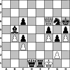 game notation in PGN-format [Event "Endspurt 2018"] [Site "www.myChess.de"] [Date "2018.11.09"] [Round "1"] [White "Achimkogge"] [Black "faustballer"] [ECO "D00"] [WhitemyELO "1371"] [BlackmyELO "1449"] [Result "1/2-1/2"] [TimeControl "10/864000"] [WhiteDays "03"] [BlackDays "10"] [MyChessNo "113434"] 1. d4 d5 2. c3 Nc6 3. Bf4 h6 4. e3 a6 5. h3 b5 6. Nf3 Nf6 7. Bd3 Bb7 8. O-O e6 9. Nbd2 Bd6 10. Ne5 Bxe5 11. dxe5 Nd7 12. Nf3 g5 13. Bg3 h5 14. h4 g4 15. Ng5 Ncxe5 16. Be2 Qe7 17. b4 f6 18. Nxe6 Qxe6 19. Qd4 Nc6 20. Qd3 O-O-O 21. a4 Nde5 22. Qc2 Nb8 23. axb5 axb5 24. Bxb5 c6 25. Be2 Kd7 26. Rfd1 Ke7 27. Ra7 Rd7 28. Rd4 Kf7 29. Ra5 Kg7 30. Bf4 Ng6 31. Bg3 Ne5 32. Ra7 Qe8 33. Qf5 Re7 34. Rf4 Qf7 35. Ra5 Nbd7 36. Ra7 Bc8 37. Rc7 Ng6 38. Rd4 Nde5 39. Rxe7 Qxe7 40. Qb1 f5 41. f4 Nc4 42. Bxc4 dxc4 43. Qc1 Ba6 44. Qd2 Kh6 45. Rd6 Bb5 46. Qd4 Re8 47. Kf2 Qe4 48. Qf6 Qxe3+ 49. Kf1 Qc1+ 50. Rd1 Qxd1+ 51. Be1 Rxe1+ 1/2-1/2 position notation in FEN-format 8/8/2p2Qnk/1b3p1p/1Pp2PpP/2P5/6P1/3qrK2 - - - 0 52 Captured white pieces: Captured black pieces: Click on a captured piece in order to display the desired move!
