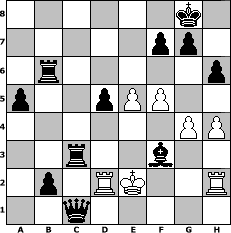 game notation in PGN-format [Event "Es weihnachtet sehr!"] [Site "www.myChess.de"] [Date "2022.12.08"] [Round "1"] [White "borsti"] [Black "faustballer"] [ECO "A02"] [WhitemyELO "1351"] [BlackmyELO "1542"] [Result "0-1"] [TimeControl "10/1728000"] [WhiteDays "20"] [BlackDays "20"] [MyChessNo "128459"] 1. f4 e6 2. e4 a6 3. Bc4 b5 4. Bb3 Bb7 5. d3 Nc6 6. Be3 a5 7. a4 b4 8. d4 Be7 9. Nf3 Nf6 10. e5 Ne4 11. O-O Bh4 12. g3 Be7 13. Bd5 exd5 14. Nbd2 Nxd2 15. Qxd2 h6 16. b3 d6 17. Rfe1 Bc8 18. Qg2 Be6 19. Re2 Bg4 20. h3 Bf5 21. Rc1 Be4 22. Qf1 dxe5 23. Nxe5 Nxe5 24. dxe5 Rc8 25. Bd4 c5 26. Bf2 Qd7 27. g4 c4 28. Rd2 cxb3 29. Bd4 bxc2 30. f5 O-O 31. Qb5 Qxb5 32. axb5 Bc5 33. Bxc5 Rxc5 34. b6 Rb8 35. Kf2 Rxb6 36. h4 b3 37. Ke3 b2 38. Rh1 c1=Q 39. Rhh2 Rc3+ 40. Ke2 Bf3+ 0-1 position notation in FEN-format 6k1/5pp1/1r5p/p2pPP2/6PP/2r2b2/1p1RK2R/2q5 - - - 4 41 Captured white pieces: ![]() ![]() ![]() ![]() ![]() ![]() ![]() ![]() ![]() ![]() ![]() ![]() ![]() ![]() ![]() Captured black pieces: ![]() ![]() ![]() ![]() ![]() ![]() ![]() ![]() ![]() ![]() ![]() ![]() ![]() ![]() ![]() Click on a captured piece in order to display the desired move!