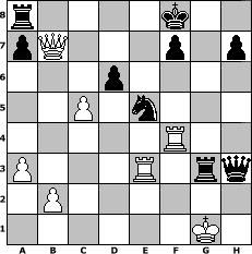 game notation in PGN-format [Event "Winterende2014"] [Site "www.myChess.de"] [Date "2014.03.06"] [Round "2"] [White "faustballer"] [Black "muellerh"] [ECO "C00"] [WhitemyELO "1532"] [BlackmyELO "1532"] [Result "0-1"] [TimeControl "10/1728000"] [WhiteDays "76"] [BlackDays "74"] [MyChessNo "93397"] 1. e4 e6 2. g3 d5 3. Bg2 Nc6 4. exd5 exd5 5. a3 Nf6 6. Nc3 Nd4 7. Nge2 Qe7 8. Nxd5 Nxd5 9. Bxd5 Bg4 10. f3 Bxf3 11. Bxf3 Nxf3+ 12. Kf2 Qf6 13. Nf4 Ne5 14. d4 Nc6 15. c3 g5 16. Re1+ Be7 17. d5 Nd8 18. d6 cxd6 19. Qa4+ Nc6 20. Kg2 gxf4 21. Bxf4 Kf8 22. Rf1 Qe6 23. Rae1 Qd5+ 24. Kg1 Bg5 25. c4 Qd4+ 26. Kg2 Bxf4 27. Rxf4 Qd2+ 28. Kf1 Qxh2 29. Qb3 Ne5 30. c5 Qh3+ 31. Kg1 Rg8 32. Re3 Rg7 33. Qxb7 Rxg3+ 0-1 position notation in FEN-format r4k2/pQ3p1p/3p4/2P1n3/5R2/P3R1rq/1P6/6K1 - - - 0 34 Captured white pieces: Captured black pieces: Click on a captured piece in order to display the desired move!