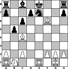 game notation in PGN-format [Event "Gl"] [Site "www.myChess.de"] [Date "2012.06.07"] [Round "1"] [White "Haki"] [Black "faustballer"] [ECO "A00"] [WhitemyELO "1333"] [BlackmyELO "1542"] [Result "1-0"] [TimeControl "10/2592000"] [WhiteDays "60"] [BlackDays "60"] [MyChessNo "82026"] 1. Nc3 e5 2. Nf3 Nc6 3. d4 exd4 4. Nxd4 Nxd4 5. Qxd4 c6 6. e4 b6 7. b4 f6 8. Bc4 Bxb4 9. O-O Bxc3 10. Qxc3 Qc7 11. Re1 Qe5 12. Bb2 Qxc3 13. Bxc3 Ne7 14. e5 b5 15. exf6 gxf6 16. Bxf6 1-0 position notation in FEN-format r1b1k2r/p2pn2p/2p2B2/1p6/2B5/8/P1P2PPP/RN2R1K1 - kq - 0 16 Captured white pieces: ![]() ![]() ![]() ![]() ![]() ![]() ![]() ![]() ![]() ![]() ![]() ![]() ![]() ![]() ![]() Captured black pieces: ![]() ![]() ![]() ![]() ![]() ![]() ![]() ![]() ![]() ![]() ![]() ![]() ![]() ![]() ![]() Click on a captured piece in order to display the desired move!