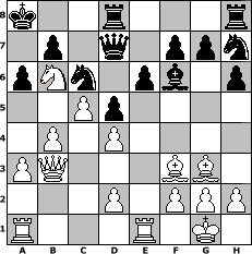 game notation in PGN-format [Event "9er5"] [Site "www.myChess.de"] [Date "2015.01.04"] [Round "1"] [White "Naunhofer"] [Black "borsti"] [ECO "D02"] [WhitemyELO "1605"] [BlackmyELO "1325"] [Result "1-0"] [TimeControl "10/3456000"] [WhiteDays "40"] [BlackDays "40"] [MyChessNo "97416"] 1. d4 d5 2. Nf3 Bg4 3. e3 e6 4. c4 c5 5. Be2 Bxf3 6. Bxf3 Nf6 7. O-O Na6 8. Nc3 Qb6 9. b3 cxd4 10. exd4 Nb4 11. Bg5 Be7 12. a3 Nc6 13. c5 Qc7 14. b4 O-O-O 15. Re1 h6 16. Bh4 Nh7 17. Bg3 Qd7 18. Qb3 Bf6 19. Nb5 a6 20. Nd6+ Kb8 21. Nc4+ Ka8 22. Nb6+ 1-0 position notation in FEN-format k2r3r/1p1q1ppn/pNn1pb1p/2Pp4/1P1P4/PQ3BB1/3P1PPP/R3R1K1 - - - 5 22 Captured white pieces: Captured black pieces: Click on a captured piece in order to display the desired move!