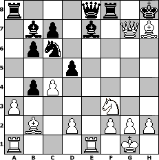 game notation in PGN-format [Event "Turnier f"] [Site "www.myChess.de"] [Date "2008.08.21"] [Round "1"] [White "andreas007"] [Black "Knight"] [ECO "D31"] [WhitemyELO "1385"] [BlackmyELO "1208"] [Result "1-0"] [TimeControl "10/2592000"] [WhiteDays "89"] [BlackDays "85"] [MyChessNo "47286"] 1. d4 d5 2. c4 e6 3. Nc3 Bb4 4. e3 Nf6 5. Nf3 Nc6 6. Bd3 Ne4 7. O-O O-O 8. Nxe4 dxe4 9. Bxe4 f5 10. Bd3 b6 11. a3 Be7 12. b4 a6 13. Bb2 a5 14. Qc2 axb4 15. e4 fxe4 16. Bxe4 Bb7 17. Bxh7+ Kh8 18. Rfe1 Qd7 19. d5 exd5 20. Qg6 Qe8 21. Qxg7# 1-0 position notation in FEN-format r3qr1k/1bp1b1QB/1pn5/3p4/1pP5/P4N2/1B1P1PPP/R3R1K1 - - - 0 21 Captured white pieces: ![]() ![]() ![]() ![]() ![]() ![]() ![]() ![]() ![]() ![]() ![]() ![]() ![]() ![]() ![]() Captured black pieces: ![]() ![]() ![]() ![]() ![]() ![]() ![]() ![]() ![]() ![]() ![]() ![]() ![]() ![]() ![]() Click on a captured piece in order to display the desired move!