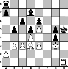 game notation in PGN-format [Event "Bobby Fischer lebt Teil 2"] [Site "www.myChess.de"] [Date "2009.09.02"] [Round "1"] [White "Papale"] [Black "Haki"] [ECO "A48"] [WhitemyELO "1726"] [BlackmyELO "1510"] [Result "1-0"] [TimeControl "10/2592000"] [WhiteDays "111"] [BlackDays "114"] [MyChessNo "58743"] 1. d4 Nf6 2. Nf3 g6 3. e3 d6 4. Be2 e6 5. O-O Bg7 6. c3 O-O 7. Nbd2 d5 8. Ne5 Nbd7 9. f4 c6 10. Qe1 Nxe5 11. fxe5 Nd7 12. Qg3 f5 13. h4 b5 14. Nf3 Re8 15. h5 g5 16. Nxg5 h6 17. Nh3 Nf8 18. Nf4 Re7 19. b3 Kh7 20. Ba3 Rc7 21. Bd6 Rf7 22. Ng6 Qg5 23. Qxg5 hxg5 24. Nxf8+ Bxf8 25. Bxf8 Rxf8 26. g4 Bd7 27. Bd3 Kh6 28. Kg2 fxg4 29. Kg3 Rxf1 30. Rxf1 Kxh5 31. Rh1# 1-0 position notation in FEN-format r7/p2b4/2p1p3/1p1pP1pk/3P2p1/1PPBP1K1/P7/7R - - - 1 31 Captured white pieces: Captured black pieces: Click on a captured piece in order to display the desired move!