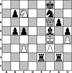 game notation in PGN-format [Event "Neue Reihe: sch"] [Site "www.myChess.de"] [Date "2009.05.15"] [Round "2"] [White "bane"] [Black "deepsabel"] [ECO "C52"] [WhitemyELO "1819"] [BlackmyELO "1977"] [Result "0-1"] [TimeControl "10/2592000"] [WhiteDays "30"] [BlackDays "30"] [MyChessNo "55741"] 1. e4 e5 2. Nf3 Nc6 3. Bc4 Bc5 4. b4 Bxb4 5. c3 Ba5 6. Bxf7+ Kxf7 7. Qb3+ Kf8 8. O-O Nf6 9. d4 d6 10. dxe5 Nxe4 11. Ba3 Nc5 12. Bxc5 dxc5 13. e6 Qe7 14. Re1 g6 15. Nbd2 Kg7 16. Re3 Bb6 17. Nc4 Qf6 18. Re1 Re8 19. Nxb6 axb6 20. R1e2 Na5 21. Qa4 Rxe6 22. Ne5 Ra6 23. Rf3 Qd8 24. Rd3 Qxd3 25. Nxd3 Rxe2 26. Qf4 Re7 27. f3 Bf5 28. Nc1 Nc6 29. Qd2 Ra8 30. Qf4 Rae8 31. Kf2 Ne5 32. Kg3 Nf7 33. h4 h5 34. Nb3 Nd6 35. Nd2 Bd3 36. Kh2 Re2 37. Nf1 Rxa2 38. Ne3 b5 39. Nd5 Bf5 40. Qg5 Nf7 41. Qf6+ Kf8 42. Nxc7 Ree2 43. Kg3 Rxg2+ 44. Kf4 Rae2 0-1 position notation in FEN-format 5k2/1pN2n2/5Qp1/1pp2b1p/5K1P/2P2P2/4r1r1/8 - - - 2 45 Captured white pieces: ![]() ![]() ![]() ![]() ![]() ![]() ![]() ![]() ![]() ![]() ![]() ![]() ![]() ![]() ![]() Captured black pieces: ![]() ![]() ![]() ![]() ![]() ![]() ![]() ![]() ![]() ![]() ![]() ![]() ![]() ![]() ![]() Click on a captured piece in order to display the desired move!