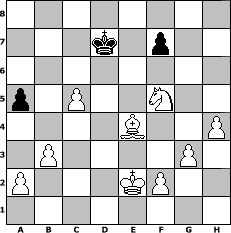 game notation in PGN-format [Event "Zwischendurchturnier"] [Site "www.myChess.de"] [Date "2011.01.14"] [Round "1"] [White "sprinterde"] [Black "Winston"] [ECO "D06"] [WhitemyELO "1629"] [BlackmyELO "1451"] [Result "1-0"] [TimeControl "10/864000"] [WhiteDays "10"] [BlackDays "10"] [MyChessNo "71140"] 1. d4 d5 2. c4 c5 3. dxc5 d4 4. e3 e5 5. exd4 exd4 6. Qe2+ Be7 7. Bg5 Qa5+ 8. Nd2 Qxc5 9. Bxe7 Nxe7 10. O-O-O O-O 11. Nb3 Qg5+ 12. Qd2 Qf6 13. Qxd4 Qxd4 14. Rxd4 Nbc6 15. Rd2 Be6 16. Nc5 Bf5 17. Nxb7 Rab8 18. Nd6 Bg6 19. h4 h5 20. Nb5 a5 21. Nf3 Rfc8 22. Nc3 Nd8 23. b3 Ne6 24. g3 Nc5 25. Ne5 Bh7 26. Bh3 Rc7 27. Rhd1 Ne6 28. Bxe6 Rf8 29. Rd8 Ng6 30. Nxg6 Bxg6 31. Rxf8+ Kxf8 32. Bd5 Bf5 33. Be4 Bd7 34. Nd5 Rc6 35. Nf4 Rc7 36. Nxh5 Bg4 37. Rd5 Re7 38. Rd8+ Re8 39. Rxe8+ Kxe8 40. Nxg7+ Kf8 41. Nf5 Be2 42. c5 Ke8 43. Kd2 Kd7 44. Kxe2 1-0 position notation in FEN-format 8/3k1p2/8/p1P2N2/4B2P/1P4P1/P3KP2/8 - - - 0 44 Captured white pieces: Captured black pieces: Click on a captured piece in order to display the desired move!