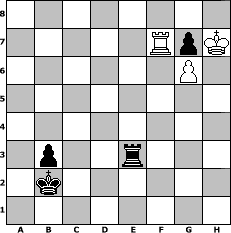 game notation in PGN-format [Event "Aljechin Verteidigung"] [Site "www.myChess.de"] [Date "2006.01.30"] [Round "2"] [White "Look"] [Black "Juliette2103"] [ECO "B03"] [WhitemyELO "1769"] [BlackmyELO "2078"] [Result "1/2-1/2"] [TimeControl "10/864000"] [WhiteDays "55"] [BlackDays "45"] [MyChessNo "22057"] 1. e4 Nf6 2. e5 Nd5 3. d4 d6 4. c4 Nb6 5. exd6 exd6 6. Nc3 Be7 7. h3 O-O 8. Nf3 Bf6 9. Be2 Re8 10. O-O Nc6 11. Re1 Bf5 12. Be3 d5 13. cxd5 Nxd5 14. Bb5 Qd6 15. Rc1 Nxe3 16. fxe3 Rad8 17. Bxc6 Qxc6 18. e4 Bg6 19. e5 Be7 20. Qb3 Qb6 21. Qxb6 axb6 22. d5 Bc5+ 23. Kh1 c6 24. d6 f6 25. Rcd1 fxe5 26. d7 Re7 27. Nxe5 Bc2 28. Rd2 Bf5 29. Rdd1 Bb4 30. a3 Bxc3 31. bxc3 Bxd7 32. Nxd7 Rxe1+ 33. Rxe1 Rxd7 34. c4 Kf7 35. Rb1 Ke6 36. Rxb6 Kd6 37. Rb3 Kc5 38. Rc3 Rd1+ 39. Kh2 h6 40. g4 b6 41. h4 Rd2+ 42. Kg3 Kd4 43. Rc1 Rd3+ 44. Kf4 Rxa3 45. Kf5 Re3 46. g5 hxg5 47. hxg5 Re5+ 48. Kg6 Re7 49. Kh7 b5 50. cxb5 cxb5 51. Rd1+ Kc3 52. Rc1+ Kb2 53. Rf1 b4 54. g6 b3 55. Rf7 Re3 1/2-1/2 position notation in FEN-format 8/5RpK/6P1/8/8/1p2r3/1k6/8 - - - 2 56 Captured white pieces: Captured black pieces: Click on a captured piece in order to display the desired move!