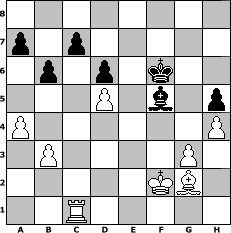 game notation in PGN-format [Event "Prätorianer"] [Site "www.myChess.de"] [Date "2023.01.04"] [Round "1"] [White "lotchi"] [Black "Mynona"] [ECO "C20"] [WhitemyELO "1229"] [BlackmyELO "1458"] [Result "1-0"] [TimeControl "10/1728000"] [WhiteDays "20"] [BlackDays "20"] [MyChessNo "128897"] 1. e4 e5 2. d3 Bc5 3. c4 d6 4. Nc3 h6 5. h4 g6 6. Be3 Bxe3 7. fxe3 f5 8. exf5 gxf5 9. g3 Nf6 10. e4 Nc6 11. Bg2 Nd4 12. exf5 Bxf5 13. Nf3 Bg4 14. Rf1 Qd7 15. Ne2 Nxe2 16. Qxe2 O-O-O 17. Qe3 Rde8 18. Nd2 b6 19. Rxf6 h5 20. Qe4 Qg7 21. Rf2 Rhf8 22. Rxf8 Rxf8 23. Qe3 Kd7 24. b3 e4 25. Rb1 exd3 26. Qxd3 Bf5 27. Ne4 Qe5 28. a4 Rg8 29. Qd5 Qxd5 30. cxd5 Rg4 31. Nf6+ Ke7 32. Nxg4 Bxg4 33. Kf2 Bf5 34. Re1+ Kf6 35. Rc1 1-0 position notation in FEN-format 8/p1p5/1p1p1k2/3P1b1p/P6P/1P4P1/5KB1/2R5 - - - 5 35 Captured white pieces: Captured black pieces: Click on a captured piece in order to display the desired move!