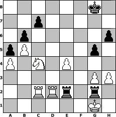 game notation in PGN-format [Event "Schach bei einem Schoppen Wein"] [Site "www.myChess.de"] [Date "2012.02.06"] [Round "1"] [White "Erich"] [Black "ClaudiaN"] [ECO "C54"] [WhitemyELO "2004"] [BlackmyELO "1755"] [Result "1/2-1/2"] [TimeControl "10/1728000"] [WhiteDays "20"] [BlackDays "20"] [MyChessNo "79756"] 1. e4 e5 2. Nf3 Nc6 3. Bc4 Bc5 4. c3 Nf6 5. d3 O-O 6. O-O d6 7. h3 h6 8. Re1 Bb6 9. Nbd2 Be6 10. Bxe6 fxe6 11. b4 a6 12. Nc4 Ba7 13. a4 Qe8 14. Be3 Bxe3 15. Rxe3 b6 16. Qb3 Nh5 17. Ncd2 Nf4 18. Kh2 Qf7 19. Rf1 Nh5 20. d4 exd4 21. cxd4 a5 22. b5 Nb4 23. Ne1 e5 24. Qxf7+ Rxf7 25. dxe5 dxe5 26. Nef3 Re7 27. Nc4 Rae8 28. Rc1 Nf6 29. Nb2 g5 30. Kg1 Rd8 31. g3 Kg7 32. Kg2 Na2 33. Re1 Nb4 34. Rc3 Na2 35. Rc6 Nb4 36. Rc4 Ne8 37. Rcc1 Nd6 38. Red1 Rf8 39. Nd2 Rd7 40. Ndc4 Rdf7 41. Nxe5 Rxf2+ 42. Kg1 Nc2 43. Nbc4 Nxc4 44. Rd7+ Kg8 45. Nxc4 Re2 46. Rd2 Rff2 47. Rcxc2 Rg2+ 48. Kh1 Rh2+ 49. Kg1 Rhg2+ 50. Kh1 Rh2+ 51. Kg1 Rhg2+ 1/2-1/2 position notation in FEN-format 6k1/2p5/1p5p/pP4p1/P1N1P3/6PP/2RRr1r1/6K1 - - - 9 52 Captured white pieces: Captured black pieces: Click on a captured piece in order to display the desired move!