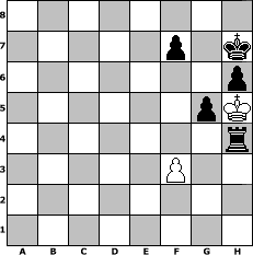 game notation in PGN-format [Event "Dabei ist alles 6"] [Site "www.myChess.de"] [Date "2009.03.21"] [Round "1"] [White "beowulf"] [Black "rikilatic"] [ECO "D20"] [WhitemyELO "1354"] [BlackmyELO "1425"] [Result "0-1"] [TimeControl "10/864000"] [WhiteDays "10"] [BlackDays "10"] [MyChessNo "54093"] 1. d4 d5 2. c4 dxc4 3. e4 a6 4. Bxc4 Nc6 5. Nf3 Bg4 6. O-O e6 7. Bg5 Be7 8. Bxe7 Ngxe7 9. d5 Bxf3 10. Qxf3 Nd4 11. Qd3 exd5 12. exd5 Ndf5 13. Re1 O-O 14. Nc3 b5 15. Bb3 Nh6 16. Rad1 Ng4 17. d6 cxd6 18. Qxd6 Qxd6 19. Rxd6 Ng6 20. h3 N4e5 21. Bd5 Rae8 22. b3 Nf3+ 23. gxf3 Rxe1+ 24. Kg2 Nf4+ 25. Kg3 Nxd5 26. Rxd5 Rc1 27. Ne4 Rc2 28. a4 bxa4 29. bxa4 Rc4 30. Ra5 Rc6 31. Nd2 h6 32. Nb3 Rd8 33. Nc5 Rd5 34. Rxa6 Rcxc5 35. Ra8+ Kh7 36. f4 Ra5 37. Rxa5 Rxa5 38. Kg4 Rxa4 39. f3 g5 40. Kh5 Rxf4 41. h4 Rxh4# 0-1 position notation in FEN-format 8/5p1k/7p/6pK/7r/5P2/8/8 - - - 0 42 Captured white pieces: Captured black pieces: Click on a captured piece in order to display the desired move!