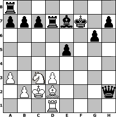 game notation in PGN-format [Event "uns Nr. 6"] [Site "www.myChess.de"] [Date "2012.10.27"] [Round "1"] [White "augustus"] [Black "Steffi"] [ECO "C57"] [WhitemyELO "1330"] [BlackmyELO "1558"] [Result "0-1"] [TimeControl "10/864000"] [WhiteDays "00"] [BlackDays "10"] [MyChessNo "84717"] 1. e4 e5 2. Nf3 Nc6 3. Bc4 Nf6 4. Ng5 d5 5. Bxd5 Nxd5 6. Nxf7 Kxf7 7. exd5 Qxd5 8. Nc3 Qxg2 9. Rf1 Be7 10. d3 Bh3 11. Qe2 Nd4 12. Qh5+ g6 13. Qxh3 Qxh3 14. Rb1 Nxc2+ 15. Kd2 Qxf1 16. Kxc2 Qxf2+ 17. Bd2 Qxh2 18. Rd1 Rhd8 19. a3 Rd7 0-1 position notation in FEN-format r7/ppprbk1p/6p1/4p3/8/P1NP4/1PKB3q/3R4 - - - 1 20 Captured white pieces: Captured black pieces: Click on a captured piece in order to display the desired move!