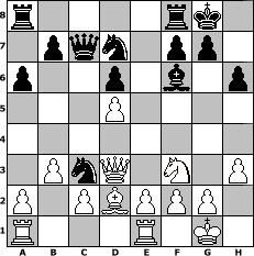 game notation in PGN-format [Event "Der Mai ist gekommen!"] [Site "www.myChess.de"] [Date "2009.05.05"] [Round "1"] [White "Nightflight"] [Black "Helmut48"] [ECO "B90"] [WhitemyELO "1604"] [BlackmyELO "1676"] [Result "0-1"] [TimeControl "10/864000"] [WhiteDays "00"] [BlackDays "20"] [MyChessNo "55423"] 1. e4 c5 2. Nf3 d6 3. d4 cxd4 4. Nxd4 Nf6 5. Nc3 a6 6. Bd3 e5 7. Nf3 Be7 8. h3 h6 9. O-O Be6 10. Be3 O-O 11. Qd2 Nbd7 12. b3 Qc7 13. Nd5 Bxd5 14. exd5 e4 15. Rfe1 Bd8 16. Bxe4 Nxe4 17. Qd3 Nc3 18. Bd2 Bf6 0-1 position notation in FEN-format r4rk1/1pqn1pp1/p2p1b1p/3P4/8/1PnQ1N1P/P1PBPPP1/R3R1K1 - - - 4 19 Captured white pieces: Captured black pieces: Click on a captured piece in order to display the desired move!