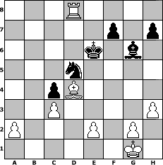 game notation in PGN-format [Event "unter uns Nr. 46 (Faslam)"] [Site "www.myChess.de"] [Date "2019.02.24"] [Round "1"] [White "S04boy"] [Black "augustus"] [ECO "C25"] [WhitemyELO "1214"] [BlackmyELO "1089"] [Result "1-0"] [TimeControl "10/864000"] [WhiteDays "13"] [BlackDays "00"] [MyChessNo "114444"] 1. e4 e5 2. Nc3 c6 3. Bc4 Qf6 4. Nf3 d6 5. d4 Bg4 6. h3 Bxf3 7. dxe5 Bxd1 8. exf6 Bxc2 9. fxg7 Bxg7 10. O-O Bxc3 11. bxc3 Nf6 12. f3 d5 13. exd5 cxd5 14. Re1+ Kf8 15. Bg5 dxc4 16. Bxf6 Rg8 17. Re7 Bg6 18. Re1 Nc6 19. Rxb7 Re8 20. Rxe8+ Kxe8 21. Rc7 Nd8 22. Rxa7 Ne6 23. f4 Nxf4 24. Ra8+ Kd7 25. Rxg8 Nd5 26. Rd8+ Ke6 27. Bd4 1-0 position notation in FEN-format 3R4/5p1p/4k1b1/3n4/2pB4/2P4P/P3P1P1/6K1 - - - 4 27 Captured white pieces: Captured black pieces: Click on a captured piece in order to display the desired move!