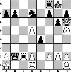 game notation in PGN-format [Event "1.Chess in Friendship"] [Site "www.myChess.de"] [Date "2004.08.10"] [Round "2"] [White "Hobbykegler"] [Black "Naunhofer"] [ECO "A45"] [WhitemyELO "1103"] [BlackmyELO "1631"] [Result "0-1"] [TimeControl "10/2592000"] [WhiteDays "86"] [BlackDays "89"] [MyChessNo "6093"] 1. d4 Nf6 2. Nc3 d5 3. Bf4 e6 4. Qd3 c5 5. dxc5 Nc6 6. O-O-O Bxc5 7. e4 dxe4 8. Qg3 Nd5 9. Nxd5 exd5 10. c4 Bd4 11. Bc7 Qf6 12. cxd5 Bxb2+ 13. Kb1 Be5 14. Bxe5 Nxe5 15. Bb5+ Bd7 16. Bxd7+ Nxd7 17. Ne2 O-O 18. Nf4 Rac8 19. Nh5 Qb6+ 20. Ka1 g6 21. Qg5 Rc2 22. Qh6 Qb2# 0-1 position notation in FEN-format 5rk1/pp1n1p1p/6pQ/3P3N/4p3/8/PqrP1PPP/K2R3R - - - 4 23 Captured white pieces: Captured black pieces: Click on a captured piece in order to display the desired move!