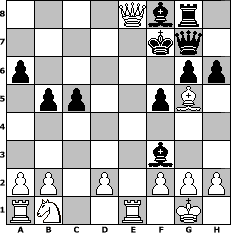 game notation in PGN-format [Event "und immer wieder Schach !"] [Site "www.myChess.de"] [Date "2009.11.06"] [Round "1"] [White "Seneca"] [Black "commander"] [ECO "D20"] [WhitemyELO "1526"] [BlackmyELO "1158"] [Result "1-0"] [TimeControl "10/864000"] [WhiteDays "25"] [BlackDays "09"] [MyChessNo "60389"] 1. d4 d5 2. c4 dxc4 3. e4 f5 4. e5 e6 5. Bxc4 a6 6. Nf3 b5 7. Bb3 c5 8. O-O Bb7 9. Bxe6 g6 10. d5 Qe7 11. Bg5 Qc7 12. Bxg8 Rxg8 13. d6 Qf7 14. Re1 h6 15. e6 Qg7 16. d7+ Nxd7 17. exd7+ Kf7 18. d8=Q Rxd8 19. Qxd8 Bxf3 20. Qe8# 1-0 position notation in FEN-format 4Qbr1/5kq1/p5pp/1pp2pB1/8/5b2/PP1P1PPP/RN2R1K1 - - - 1 20 Captured white pieces: Captured black pieces: Click on a captured piece in order to display the desired move!