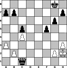 game notation in PGN-format [Event "Winter 2011/12"] [Site "www.myChess.de"] [Date "2011.12.22"] [Round "2"] [White "lasker"] [Black "retep1"] [ECO "E61"] [WhitemyELO "1286"] [BlackmyELO "1805"] [Result "0-1"] [TimeControl "10/2592000"] [WhiteDays "094"] [BlackDays "120"] [MyChessNo "78421"] 1. d4 Nf6 2. c4 g6 3. Nc3 d6 4. Nf3 Bg7 5. e3 O-O 6. Be2 Nbd7 7. O-O e5 8. e4 exd4 9. Nxd4 c6 10. Be3 Qe7 11. Qd2 Nxe4 12. Nxe4 Qxe4 13. Bf3 Qe7 14. h3 Rd8 15. Rad1 Ne5 16. Be2 c5 17. Nf3 Bf5 18. Rfe1 Be4 19. Nxe5 dxe5 20. Qc3 f5 21. Bd3 Bxd3 22. Rxd3 e4 23. Rxd8+ Rxd8 24. Qc2 Rd3 25. a3 Bd4 26. Qc1 Bxe3 27. Rxe3 Qd6 28. Kf1 Rd1+ 29. Re1 Qd3+ 30. Kg1 Rxc1 31. Rxc1 e3 32. fxe3 Qxe3+ 33. Kh2 Qxc1 0-1 position notation in FEN-format 6k1/pp5p/6p1/2p2p2/2P5/P6P/1P4PK/2q5 - - - 0 34 Captured white pieces: Captured black pieces: Click on a captured piece in order to display the desired move!